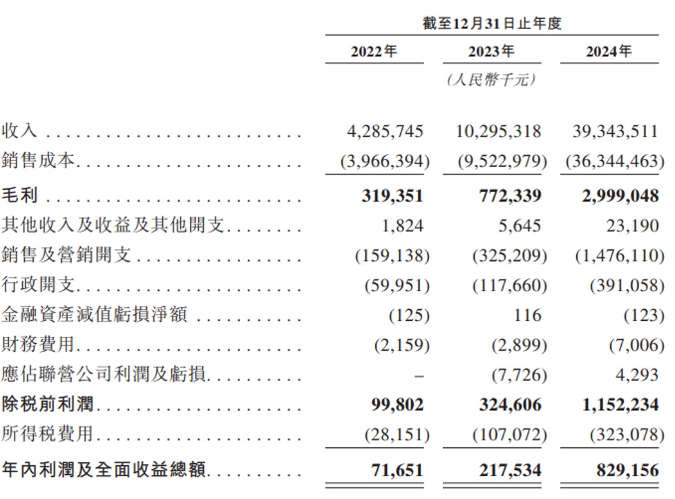 财务方面,于2022年度、2023年度、2024年度,鸣鸣很忙集团收入分别约为42.86亿元、102.95亿元、393.44亿元人民币;同期,年内利润分别约为7165.1万元、2.18亿元、8.29亿元。