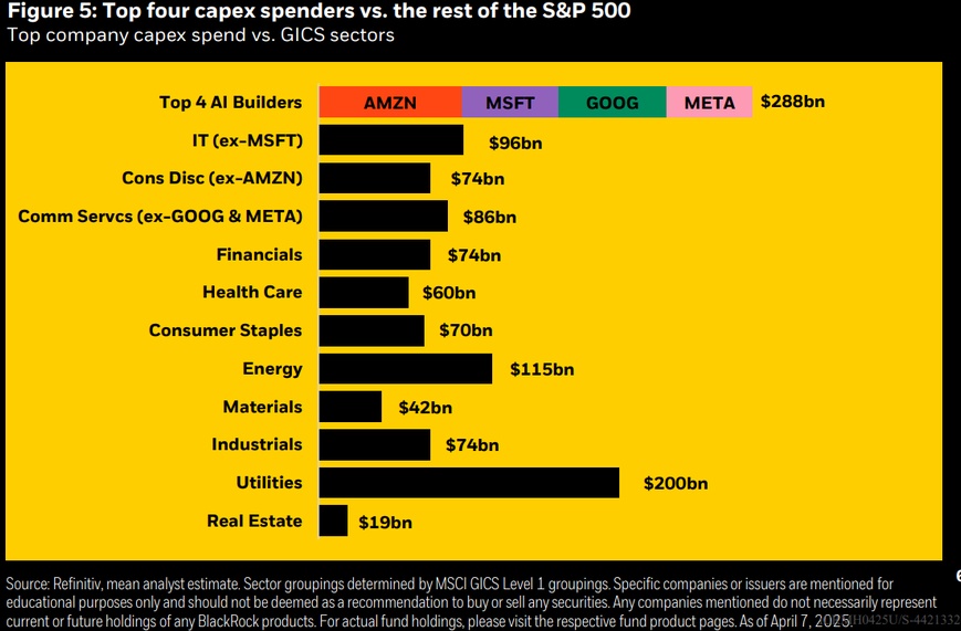 贝莱德分析团队支出,包括亚马逊、微软、谷歌以及Facebook母公司Meta在内的美国科技巨头今年计划单在AI基础设施资本支出上就有可能将大举投入逾 3150 亿美元,其中英伟达AI GPU占据主导地位,其他支出则主要集中于AI ASIC、高性能网络硬件以及核心电力设备。