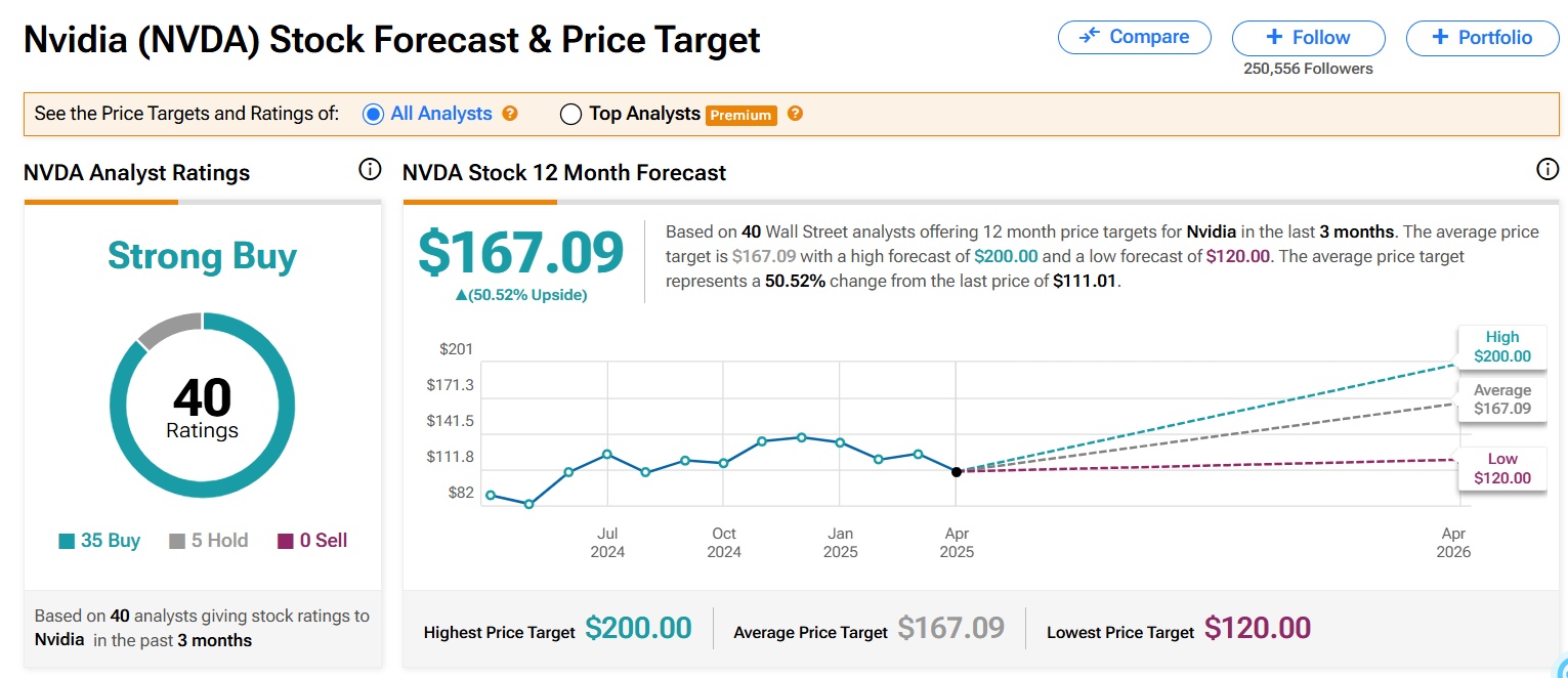 德意志银行、瑞银以及Piper Sandler在最新研报中虽然小幅下调英伟达目标股价,但是仍然予以至少135美元的12个月内目标股价,以及等同于“买入”的最乐观评级。TIPRANKS汇编的华尔街分析师最新评级与目标价显示,华尔街对于英伟达股票的共识评级为“强力买入”,并且未出现任何“卖出”评级;12个月内的平均目标价高达167美元,意味着潜在上行空间高达50%;最高目标价则高达200美元,最悲观的目标价则为120美元——仍显著高于当前股价。
