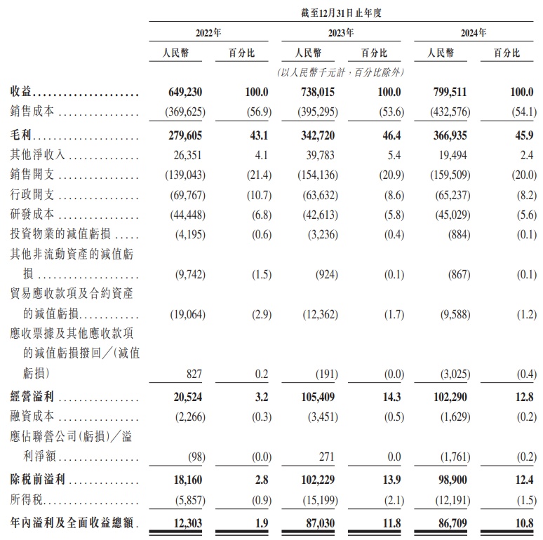 财务方面,于2022年、2023年及2024年,科拓股份收益分别约为6.49亿元、7.38亿元、8亿元人民币;同期,年内溢利及全面收益总额为1230.3万元、8703万元、8670.9万元人民币。