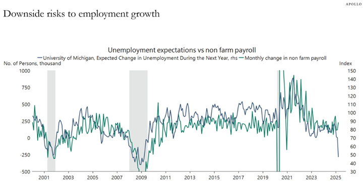 对于美国普通家庭来说,消费者信心指数已经跌至历史最低点,为了规避关税带来的涨价,消费者在关税实施前便纷纷提前购买商品,无疑透支了未来的消费力。同时,旅游业,特别是国际旅行以及外国消费者赴美旅行,开始出现明显的放缓迹象。来自阿波罗的经济学家斯洛克分析了从2025年4月到夏季的美国经济下行轨迹,强调由于关税政策屡次调整和运输时间延长等因素,将导致美国供应链出现重大中断,进而影响经济活动,最终在2025年夏季,美国可能步入经济衰退。