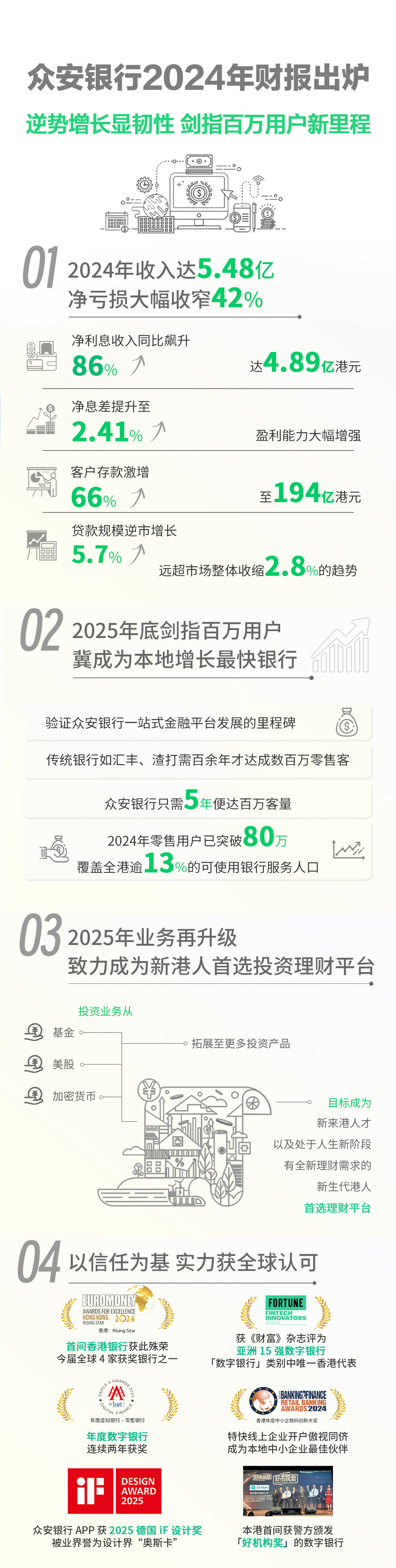 智通财经APP获悉,香港第一数字银行众安银行(ZA Bank)发布 2024年全年财报,以 “逆势增长” 的业绩印证数字银行增长韧性。2024年众安银行实现总收入5.48亿港元,同比大幅增长52.6%,其中净利息收入飙升86%至4.89亿港元,净息差扩大至2.41%,优于香港零售银行平均水平1.52%,盈利能力显著增强。客户存款激增66%至194亿港元,贷款规模逆市增长5.7%,远超市场整体收缩2.8%的颓势,展现强劲抗周期能力。净亏损同比收窄42%至2.32亿港元,并于24年7月实现单月盈利的突破,标志其业务模式可持续性获验证。