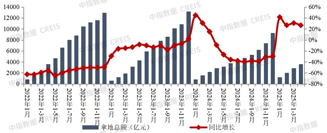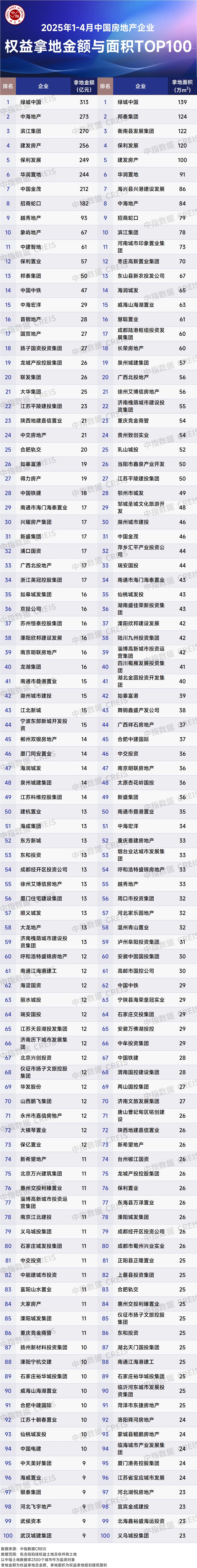 智通财经APP获悉,据中指研究院披露,2025年1-4月,TOP100企业拿地总额3608亿元,同比增长26.6%,增幅较上月减少4.0个百分点。4月热点城市土拍热度持续,22城2025年1-4月住宅用地土地出让金同比增长超四成,这一增长背后既有房企对优质地块的激烈争夺,也反映出核心区域的土地价值;部分核心城市如北京、杭州、成都、苏州、重庆、南京相继拍出高溢价地块,而更多城市的土地市场短期仍面临压力。