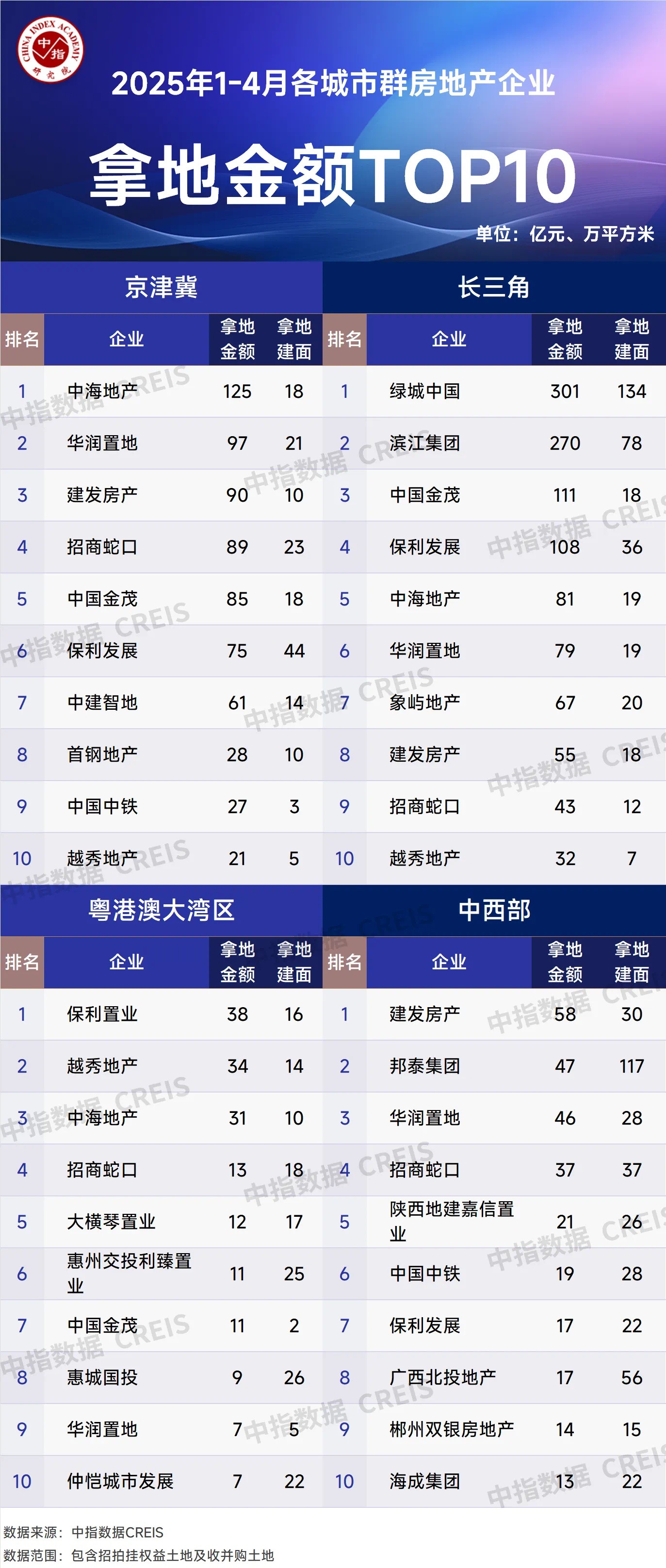 从各城市群拿地金额来看,长三角位居四大城市群之首。2025年1-4月,长三角TOP10企业拿地金额1146.7亿元,位居四大城市群之首,京津冀TOP10企业拿地金额698.0亿元,位列第二;中西部TOP10企业拿地金额289.0亿元,位居第三。