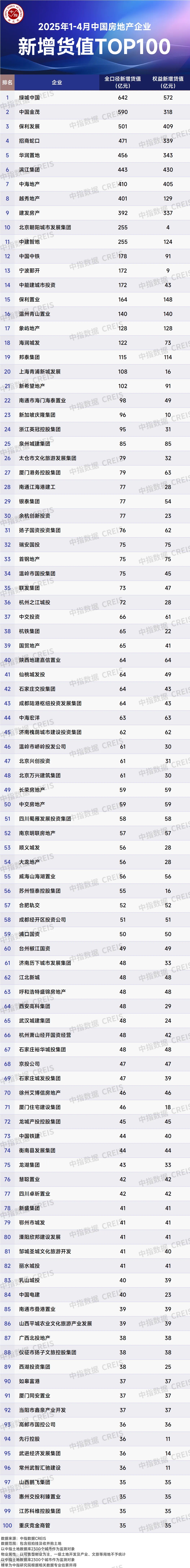 从新增货值来看,绿城中国、中国金茂和保利发展位列前三。2025年1-4月,绿城中国以642亿元新增货值占据榜单第一,中国金茂以590亿元新增货值位列第二,保利发展新增货值规模为501亿元,位列第三。TOP10企业2025年1-4月新增货值总额4561.6亿元,占TOP100企业的43.5%,新增货值门槛为35亿元。
