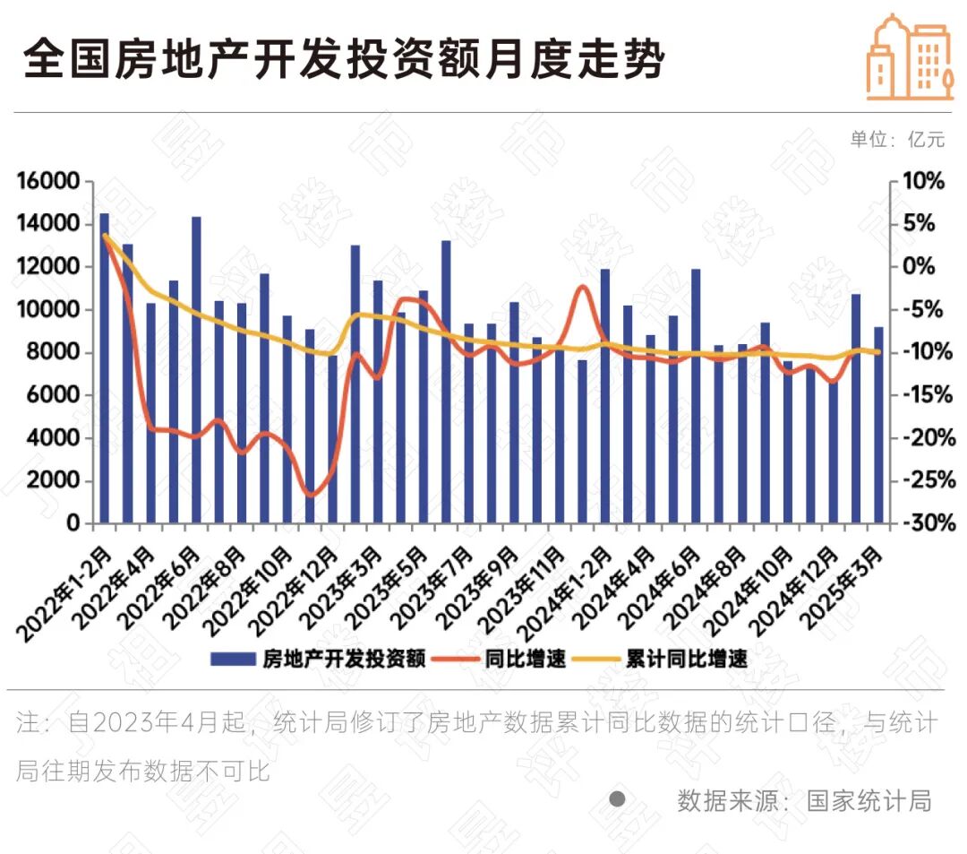 国家统计局数据显示,2025年1-3月份,全国房地产开发投资19904亿元,同比下降9.9%。 3月份房地产开发投资9184亿元,同比下降10%,降幅较前2月扩大了0.2个百分点。
