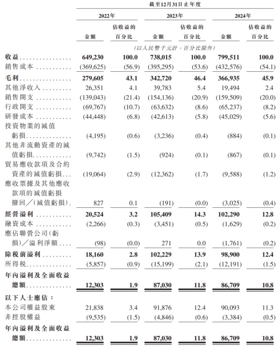 从财务数据来看,科拓股份正处于快速增长期,2022年、2023年及2024年收益分别为6.49亿元、7.38亿元、8亿元(单位为人民币,下同),年内溢利分别为1230.3万元、8703万元、8670.9万元,两年间利润增长幅度超过600%。