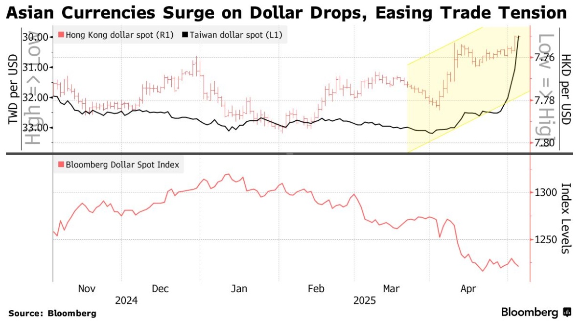 亚洲货币升值也是由投资者将资金从美元中撤出推动的。上月,由于担心特朗普的关税可能推高通胀、损害经济并阻止美联储降息,美元与长期美国国债和美国股市一起下跌。
