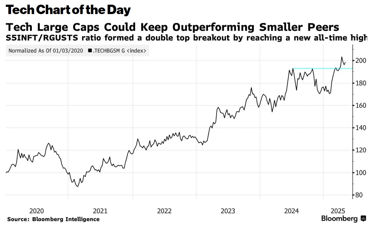 积极的技术面信号表明,标普500信息技术指数可能继续领先小盘股同行:相对于罗素2000科技指数正在形成突破,其涨势可能加速,BI策略师Gina Martin Adams和Anthony Feld在报告中写道。