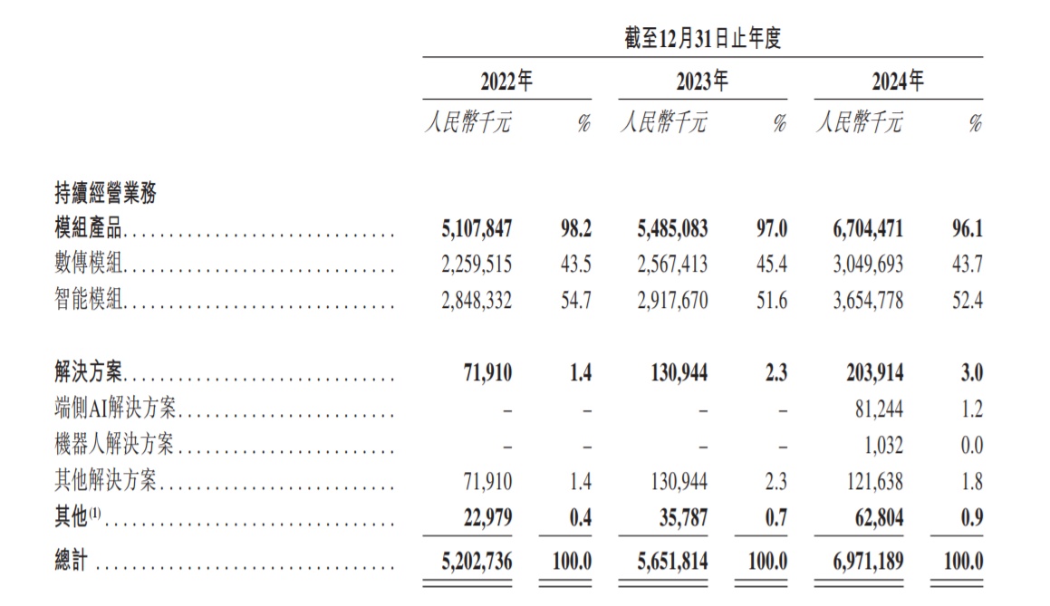 从收入结构来看,广和通当前的营收绝大部分来源于模组产品。据招股书显示,2024年中,在广和通持续经营的业务中,其模组产品收入占比96.1%,其中数传模组、智能模组的收入占比分别为43.7%、52.4%。而解决方案2024年的收入占比为3%。