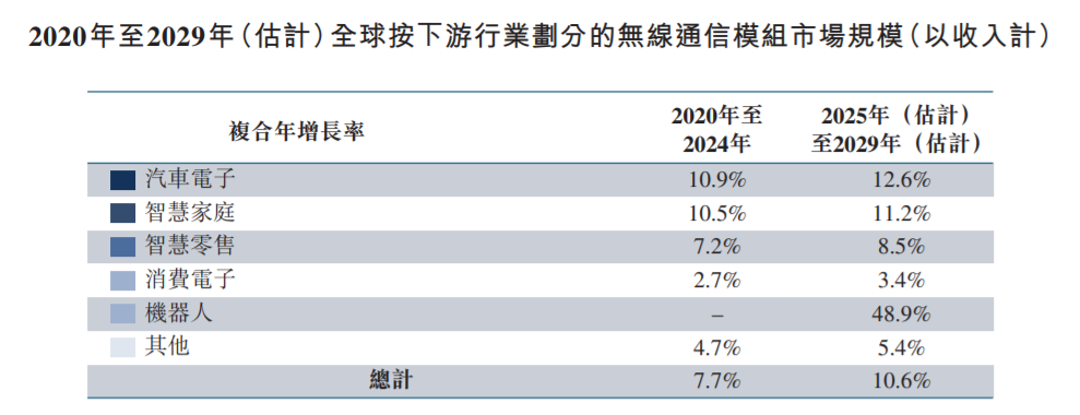 弗若斯特沙利文表示,随着5G技术成为主流以及人工智能应用的加速到来,全球无线通信模组市场发展有望进一步加速,其预计从2025年2029年,全球市场的规模将从486亿元增至726亿元,年复合增速10.6%,其中中国市场的增速为12.7%,高于全球增速。而从应用场景来看,未来五年无线通信模组在汽车电子、智慧家庭、智能零售、消费电子等细分领域中的发展速度将有所加快,而机器人领域则迎来爆发,预计四年复合增速高达48.9%。