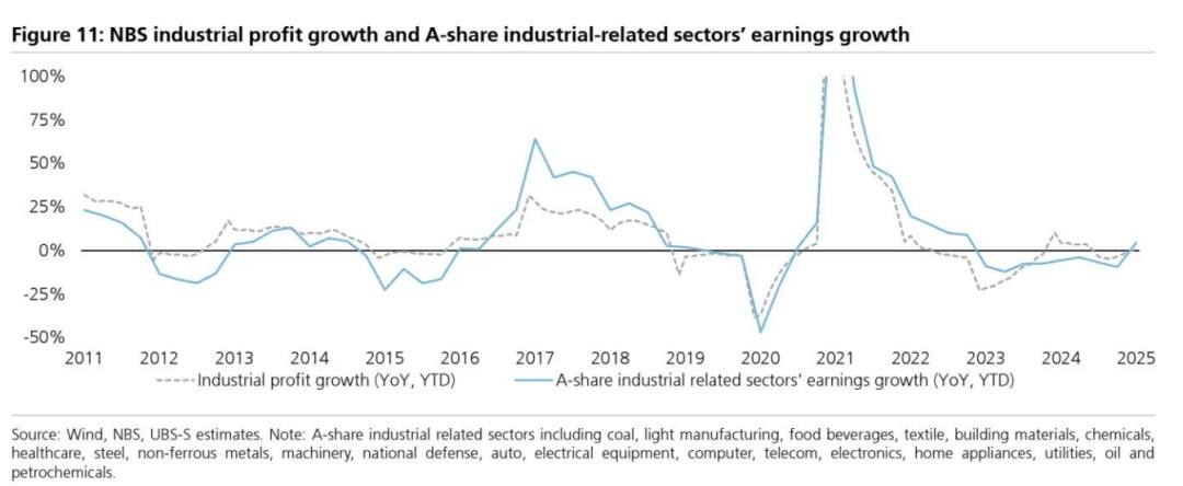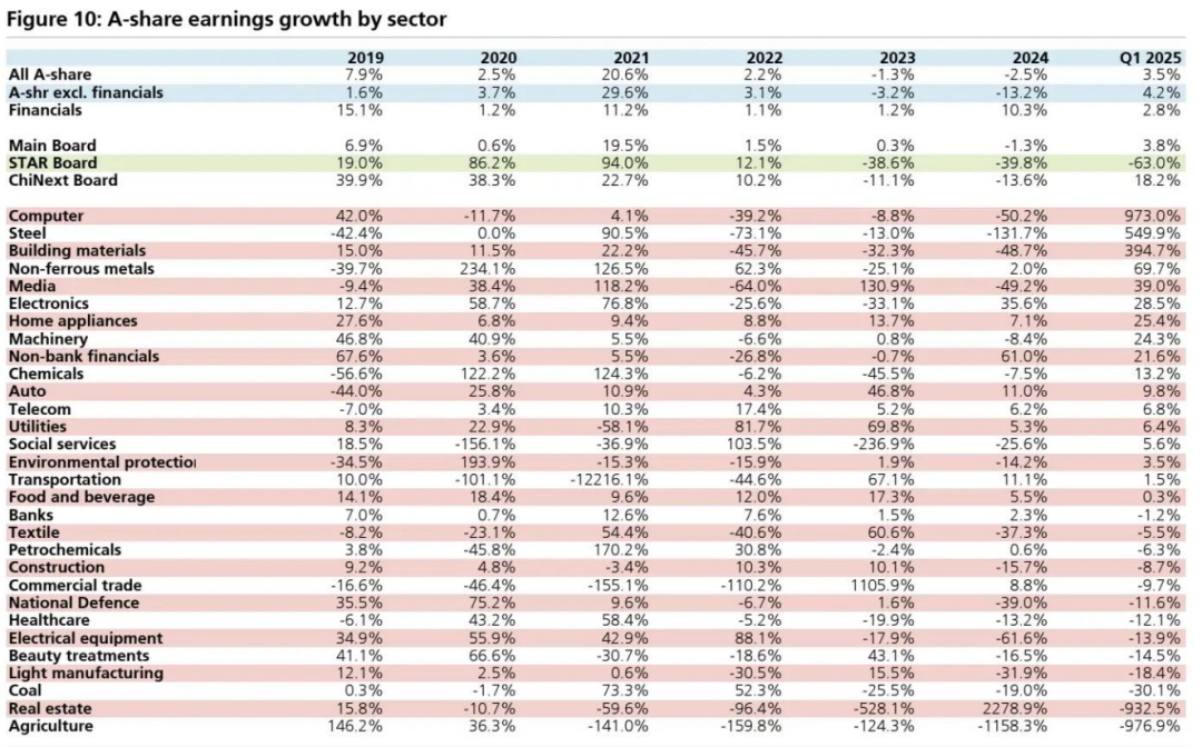 瑞银统计表显示,2025 年第一季度,A 股整体盈利同比增长 3.5%(见下表),较 2024 年第四季度 13.7% 的同比降幅有显著提升。