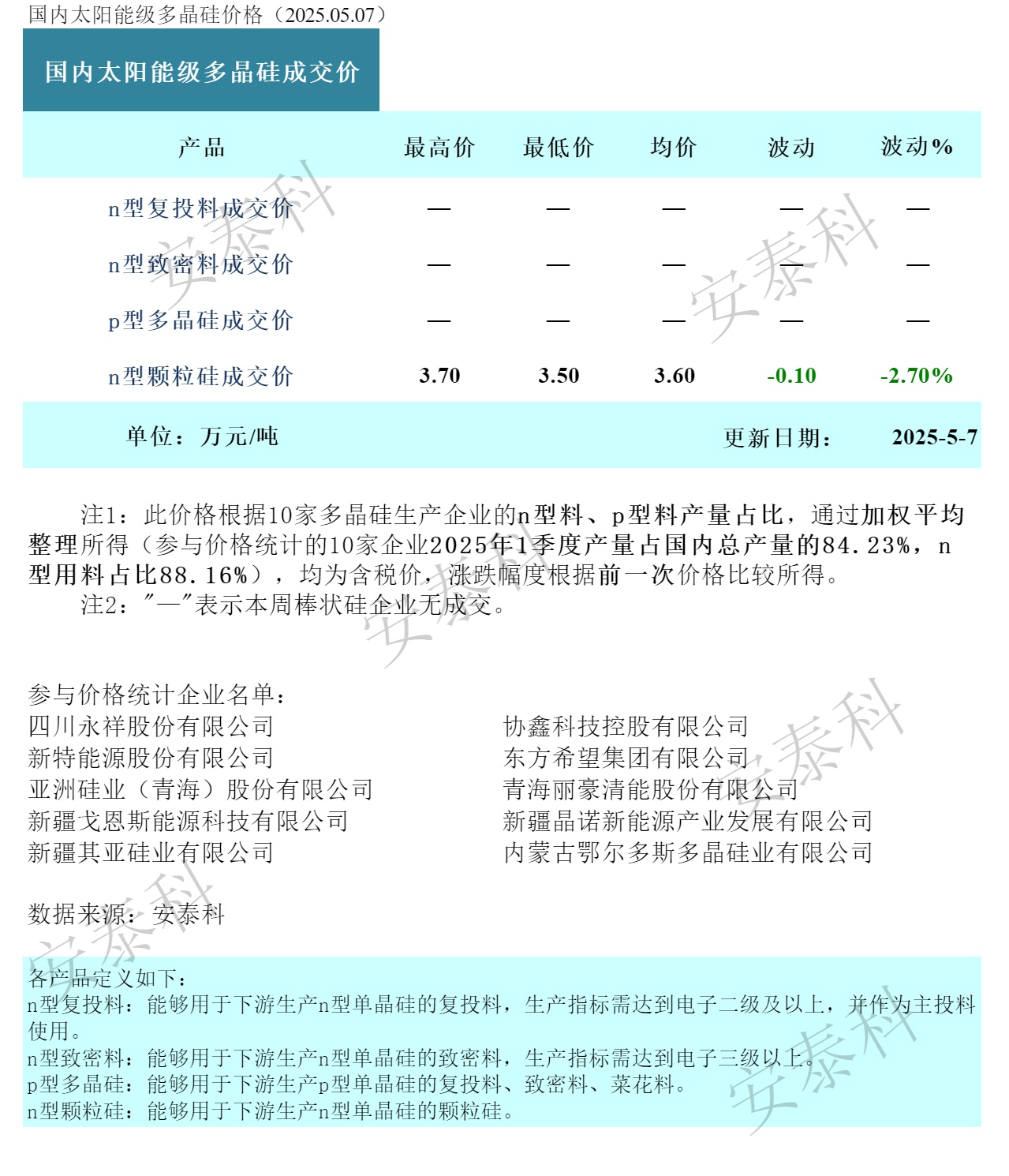 智通财经APP获悉,硅业分会发文称,本周棒状硅企业暂无成交。部分多晶硅企业有意愿将三季度的集中检修提前至二季度,或者将根据实际的签单情况对开工负荷进行临时调整。n型颗粒硅成交价格区间为3.50-3.70万元/吨,成交均价为3.60万元/吨,环比下降2.70%。