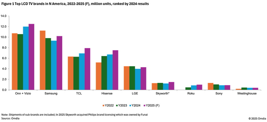 智通财经APP获悉,Omdia的电视显示面板与OEM信息服务 (TV Display & OEM Intelligence Service) 数据显示,尽管美国本土电视品牌原本预计将在2025年实现出货量的强劲增长,但随着地缘政治紧张局势加剧及关税政策变化,美国电视市场的竞争格局正经历剧烈调整。凭借在墨西哥的大规模制造能力,Samsung和LG有望从中国品牌(如海信和TCL)手中夺取更多美国市场份额,向亚洲生产为主的小尺寸电视这一细分市场扩张。相比之下,海信和TCL由于在墨西哥的产能有限,增长势头或将受阻。