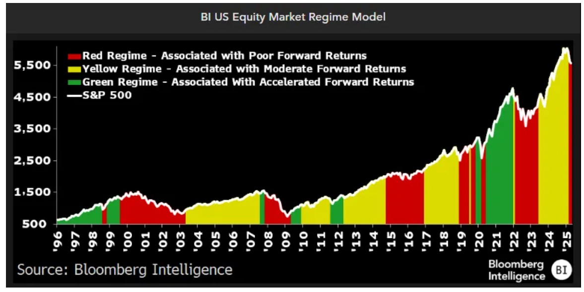 彭博行业研究的股票市场周期模型将市场划分为三个阶段——加速增长(绿色)、温和增长(黄色)和下跌(红色)。根据该机构分析师吉娜·马丁·亚当斯和吉莉安·沃尔夫汇编的数据,该模型在今年3月和4月跌入了警示性的红色区域。