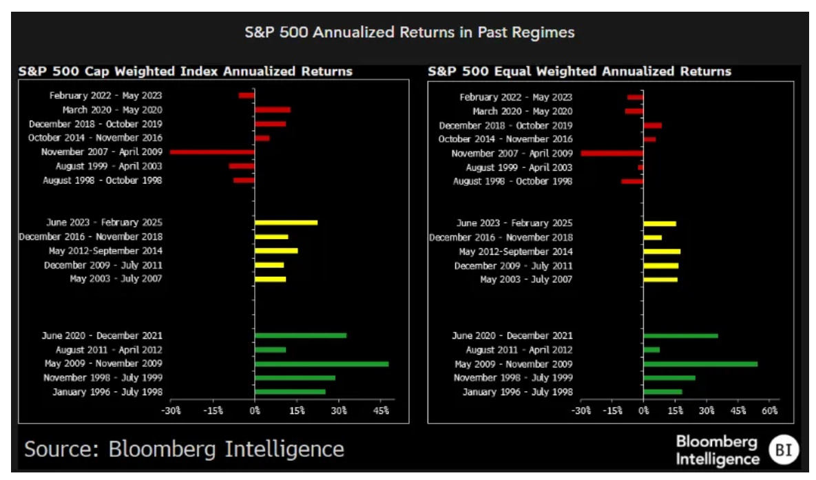 这项追溯至1996年的数据显示,红色周期通常伴随年化负收益,平均持续约16个月。标普500指数在红色周期中年化平均下跌5.6%,而在绿色周期中年化平均上涨29%。最近一次红色周期始于2020年6月,当时美股正从疫情引发的抛售中反弹。