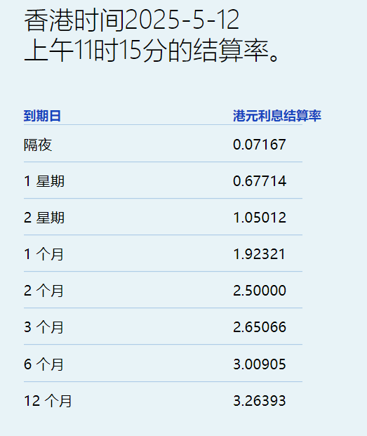 智通财经APP获悉,5月12日,港元拆息亦几乎全线向下,其中,隔夜息微跌至0.07167%,为2022年6月13日以来最低,而与楼按相关的一个月拆息连跌五天,报1.92321%,为2022年9月7日后最低。反映银行资金成本的三个月拆息回落13基点至2.65066%,为2022年8月30日后最低,六个月期报3.01167,见2022年8月9日以来最低,但一年期拆息结束四连跌,升至3.26393%。
