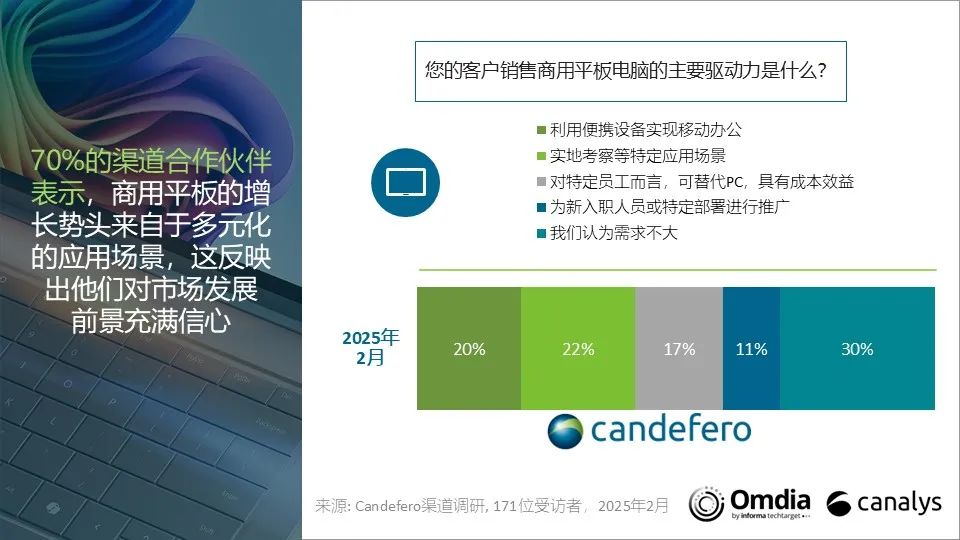 Canalys(现并入 Omdia)近期的一项调查显示,超过50%的平板电脑B2B渠道合作伙伴预计其2025年的业务将较2024年有所增长。平板电脑在职场中也逐渐被视为实用的计算替代设备。在另一项调查中,超过20%的受访者表示计划为客户的移动办公员工配备平板电脑,另有近17%的受访者认为平板电脑是传统PC的经济替代方案,适用于某些特定岗位。然而,仍有30%的受访者表示未观察到显著需求,反映出企业采购平板电脑的决策往往具有可选性,特别是在多数员工倾向于自带设备(BYOD)的情况下。