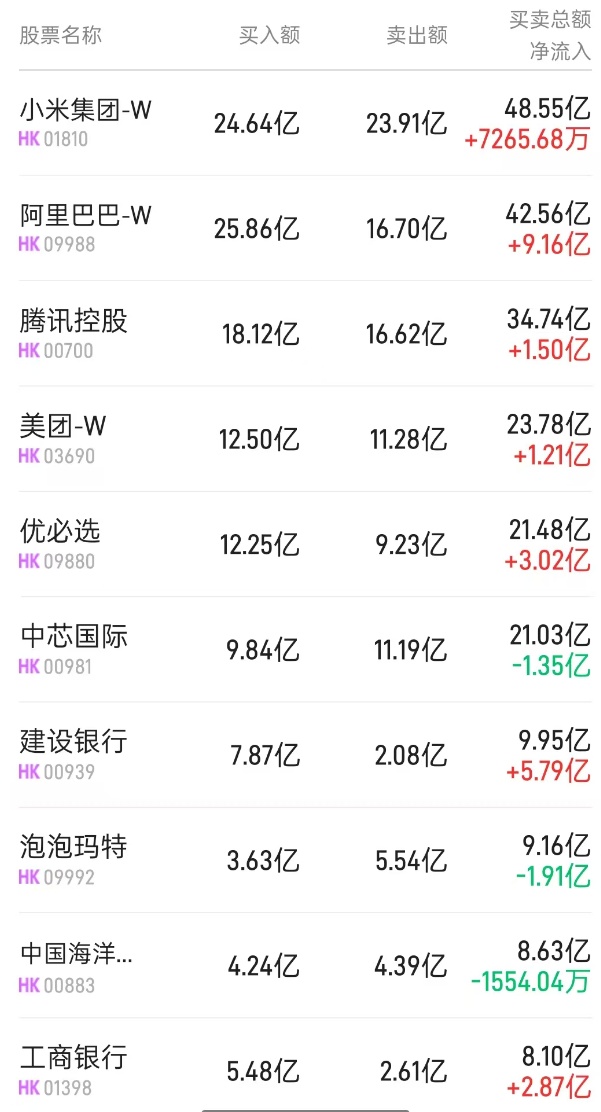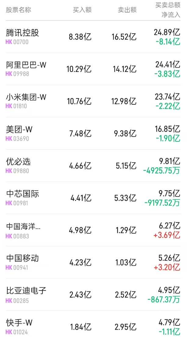 此外,中国移动(00941)、优必选(09880)分别获净买入3.2亿、2.52亿港元。而比亚迪电子(00285)、腾讯(00700)分别遭净卖出867万、6.63亿港元。
