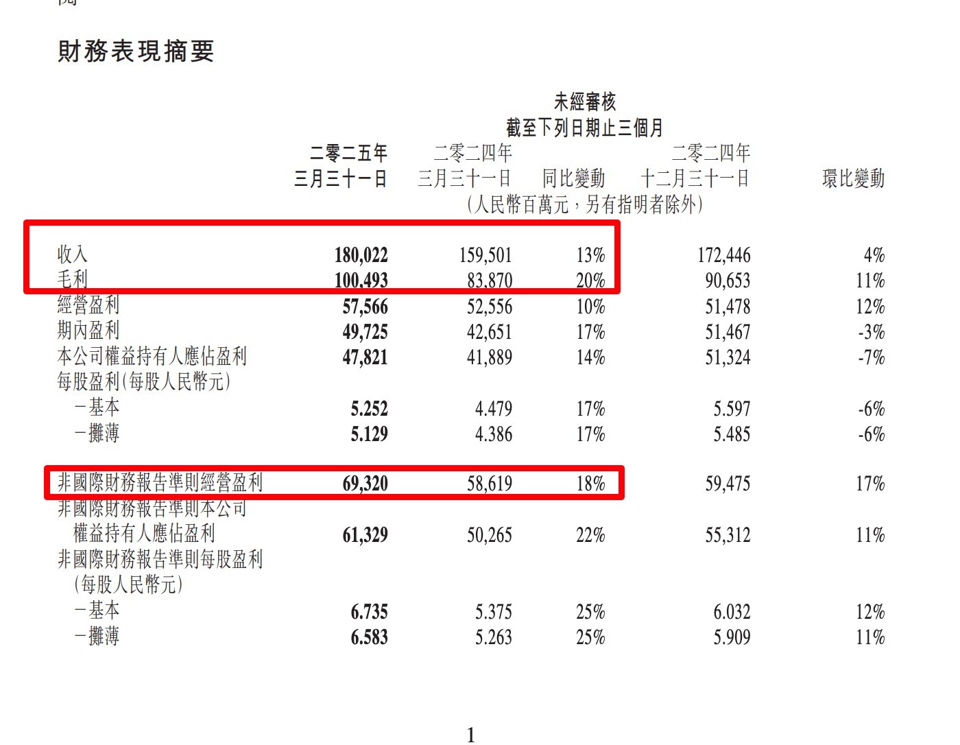 5月14日盘后,腾讯控股发布最新业绩,2025年第一季度总收入为人民币1800.22亿元,同比增长13%;毛利1004.93亿元,同比增长20%;按非国际财务报告准则的经营盈利为693.20亿元,同比增长18%。
