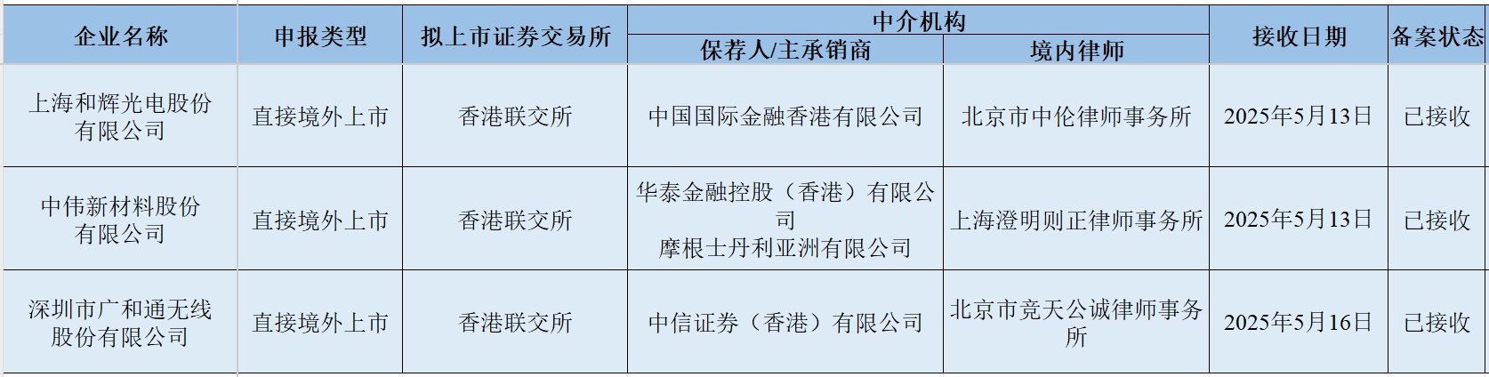 智通财经APP获悉,5月16日,中国证监会发布境内企业境外发行证券和上市备案情况表(首次公开发行及全流通)(截至2025年5月16日)。本周(5月12日-16日),新增和辉光电(688538.SH)、中伟股份(300919.SZ)、广和通(300638.SZ)拟香港IPO获中国证监会接收材料。