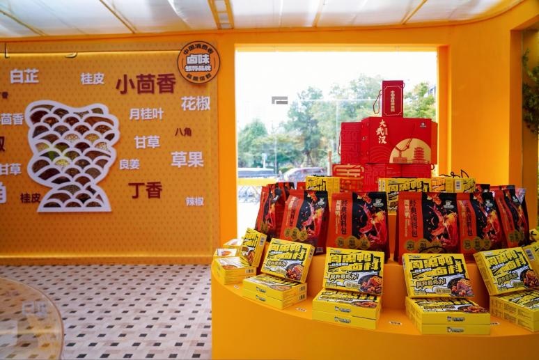 徽章、眼罩、小黄帽、文化衫、双肩包、异形抱枕......发布会现场,周黑鸭快闪店秒变潮流打卡地,错落悬挂的香辛料标本墙如同香料博物馆,让人流连忘返。