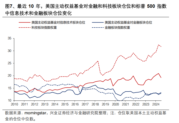 另一个非常有意思的现象是,美国主动基金自身似乎缺乏重仓科技板块的信心。尽管2012-2014年以来,随着智能手机和移动互联网诞生,经济增长引擎逐渐切换至科技产业,且科技股超额收益也逐渐凸显,但2000-2006年爆发式扩张的美国主动权益基金过度“路径依赖”于传统“价值投资”理念,而无法完全适配高资本开支、高成长性、高估值的新兴科技产业。因此过去10年美国主动权益基金依然重仓金融等传统低估值行业,2013-2024Q3,美国主动基金未大幅增持科技板块,信息技术板块仓位长期低于指数权重,反倒是金融板块的仓位长期稳定在13%-15%左右。这也是拖累其收益、导致其跑输指数、乃至规模收缩负反馈的重要原因。