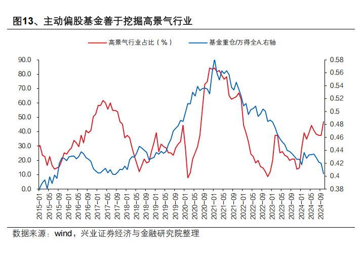 因此我们可以总结:一方面,中国本身处在转型升级期,经济结构、产业结构并未固化,本身具备更多α机会。另一方面,中国主动投资也更擅于挖掘产业趋势中的α,并且更敢于超配和重仓高景气、高成长行业。作为印证,我们可以看到2015年以来高景气行业占比(基于188景气比较框架,详见《188行业景气拼图:行业配置框架的重构》(20240404))和基金重仓股的超额收益有较高的相关性。