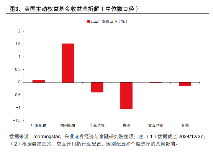 美国主动权益基金攫取α的能力较弱,而拉长时间看,中国主动权益基金的α收益显著。根据晨星统计,过去十年,美国主动权益基金的收益率来源核心是市场β,产品自身的α较弱。根据归因分析,国别配置,即美股自身的β,是美国主动权益基金超额收益的核心来源,而个股选择对超额收益的贡献为负值。作为对比,拉长时间看,中国主动权益基金的α收益显著。