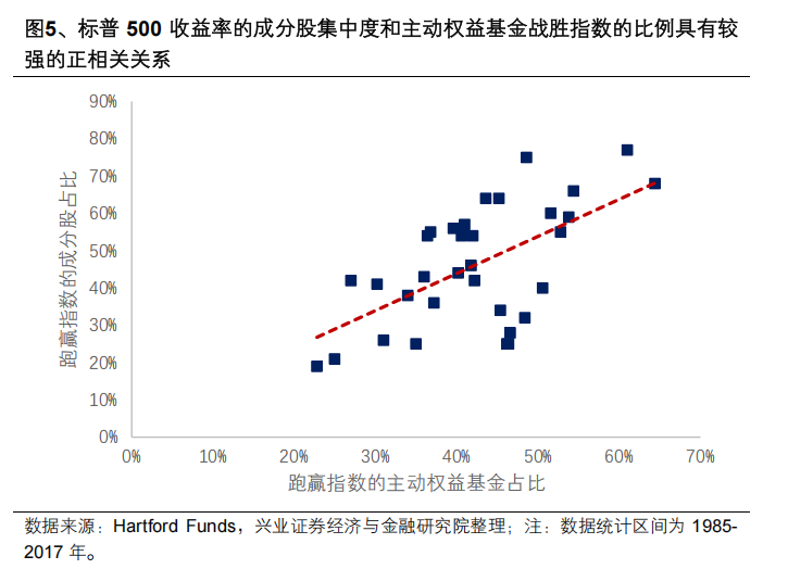 美股科技巨头过高的集中度导致美国主动基金挖掘α困难重重。美国经济转为科技驱动后,愈发成熟的科技行业形成了“产业—股市”的良性循环,大盘科技龙头“强者恒强”,而随着市场收益率过于集中于科技板块的少数几只个股后,主动权益基金在其他板块和个股当中选出具备α属性个股的难度较高。根据Hartfort Funds研究,跑赢指数的成分股占比(衡量市场集中度)和主动权益基金跑赢比例有较强的正相关性。
