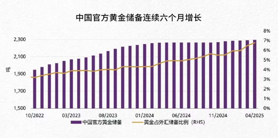 4 月再次购入黄金 2.2 吨,推动中国官方黄金储备总量升至 2295 吨,占外汇储备总额的 6.8%。