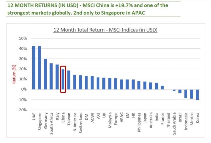 MSCI 中国指数回报率为 + 19.7%,是全球表现最强劲的市场之一,在亚太地区仅次于新加坡。
