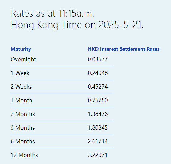 智通财经APP获悉,5月21日,港元拆息持续走低,其中,与楼按相关的一个月拆息跌20基点至0.75780%,为2022年7月15日后最低,并连续四天下跌;不过,隔夜息微升至0.03577%。