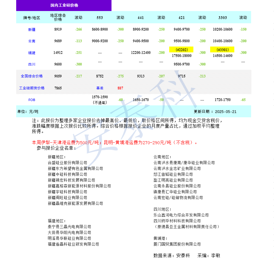 智通财经APP获悉,5月21日,硅业分会发文称,本周工业硅现货价格下跌。过去一周(2025年5月14日-21日),主力合约收盘价从8410元/吨震荡波动至7865元/吨,跌幅为6.48%。全国综合价格为9059元/吨,下跌217元/吨,其中分牌号来看,553为8752元/吨、441为9313元/吨、421为9715元/吨,分别下跌275元/吨、207元/吨和213元/吨,新疆、云南、福建和四川的综合价格为8919元/吨、9689元/吨、14912元/吨和9600元/吨。FOB价格下跌50-60美元/吨。