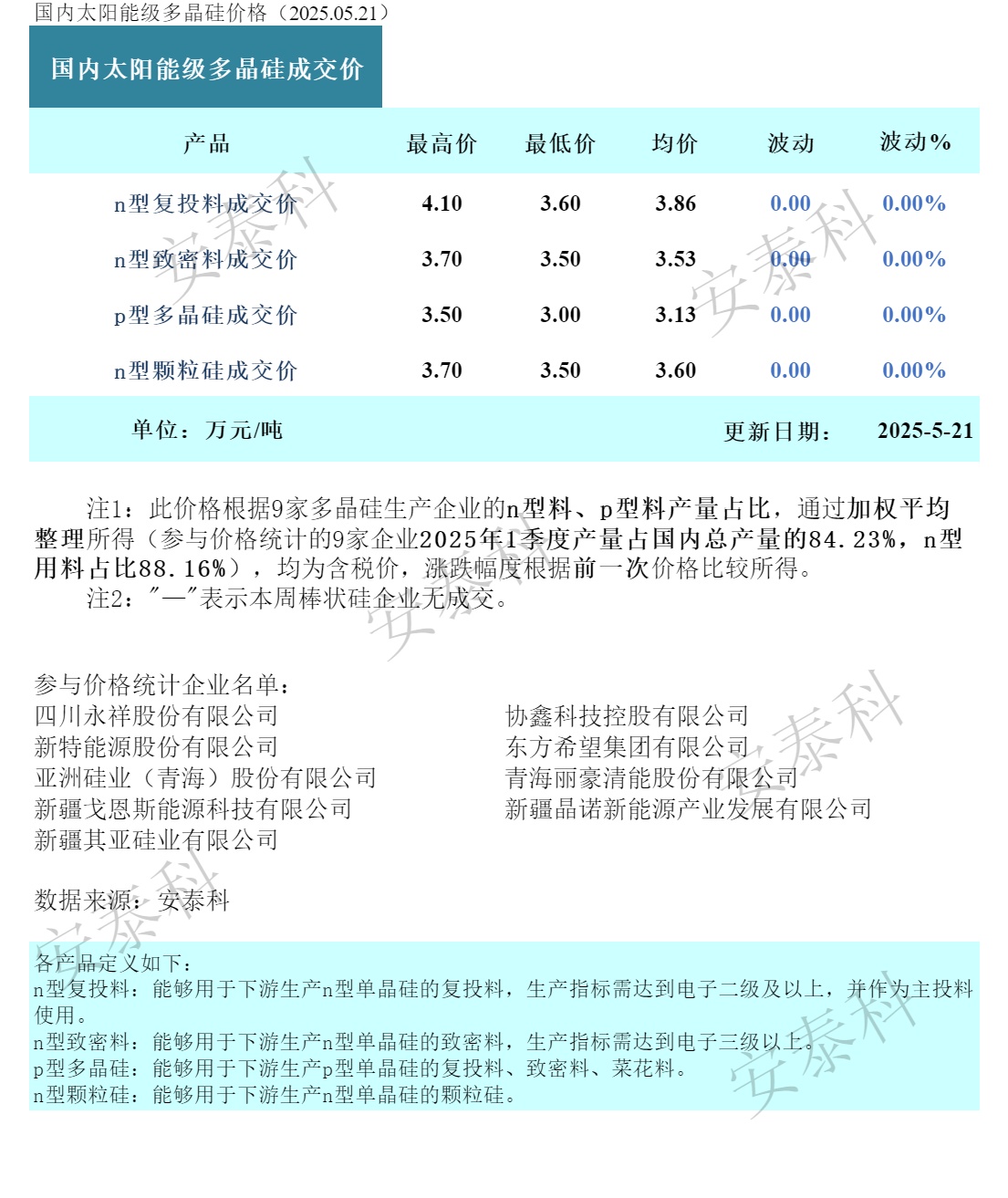 本周n型复投料成交价格区间为3.60-4.10万元/吨,成交均价为3.86万元/吨;n型颗粒硅成交价格区间为3.50-3.70万元/吨,成交均价为3.60万元/吨;p型多晶硅成交价格区间为3.00-3.50万元/吨,成交均价为3.13万元/吨。