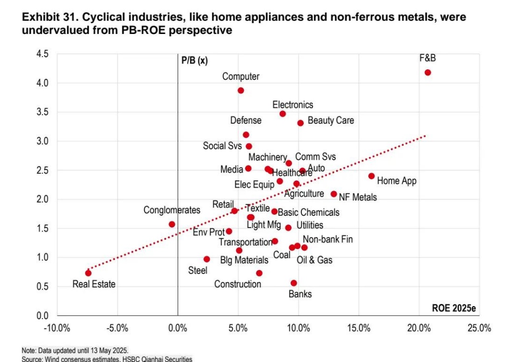 周期性行业 2025 年一季度盈利改善,整体盈利同比增长 18.8%(2024 年三季度为 - 17.9%),ROE(TTM)为 7.4%,净利率 3.8%。鉴于以下因素,汇丰预计周期性行业将出现结构性机会:1)政策稳步推出;2)房地产市场结构性复苏;3)估值具有吸引力。
