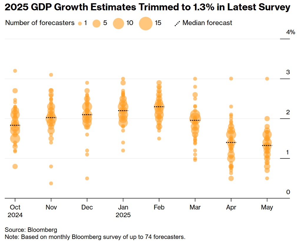 消费端呈现韧性但增速趋缓:第二季度消费者支出增速预期从4月的1%上调至1.5%,但预计下半年将逐步放缓。企业投资前景则显悲观,本季度私人投资预期增速从-3%大幅下调至-5.2%,且未来数季度预期持续走弱。