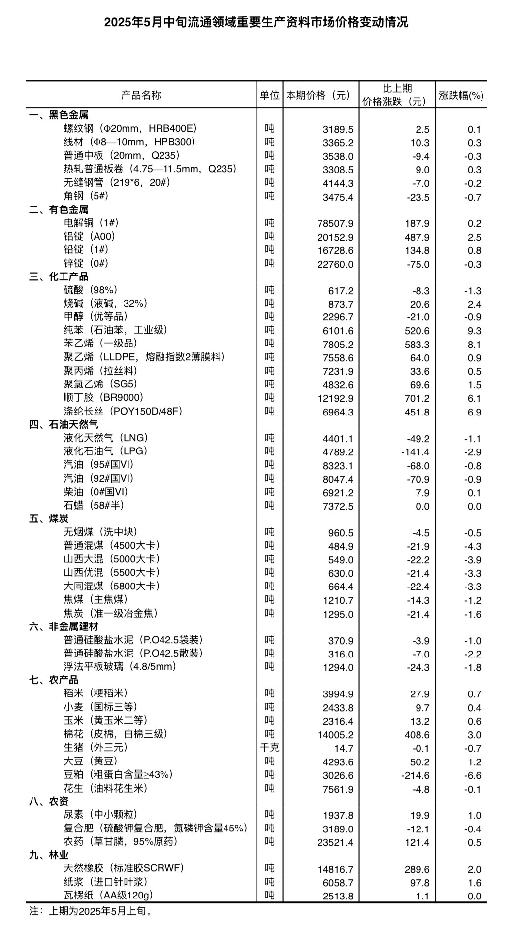 智通财经APP获悉,国家统计局5月24日消息,据对全国流通领域9大类50种重要生产资料市场价格的监测显示,2025年5月中旬与5月上旬相比,24种产品价格上涨,24种下降,2种持平。其中,生猪(外三元)价格14.7/千克,下降0.7%;豆粕(粗蛋白含量≥43%)价格3026.6元/吨,下降6.6%。