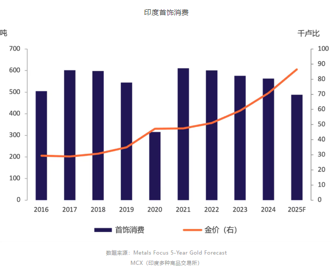 首先来看金价涨至创纪录高位对需求的影响,2025年一季度印度黄金首饰消费量同比下降25%,至71吨,创出2020年三季度以来单季消费量的新低。由于消费者购买首饰的预算通常为固定预算,金价涨至创纪录高位意味着可购买的金饰重量下降。此外,金价涨速很快,存在近期回落的预期,也促使印度消费者暂缓购买金饰。