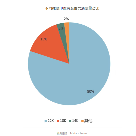 为吸引消费者,印度零售商还开始加大力度推销价格相对较低,兼具现代设计感的14K和18K黄金首饰。在同等资本支出下,零售商也能够保有更多14K和18K金饰库存。历史上普货金饰一直是印度黄金首饰市场上的主导产品,其中大多数为22K金饰。据MetalsFocus估算,目前22K金饰的市占率达75%-80%,18K和14K金饰的市占率分别为15%-18%和3%-5%。虽然市占率仍较低,但过去十多年来这两大细分品类金饰的销量持续稳健增长。