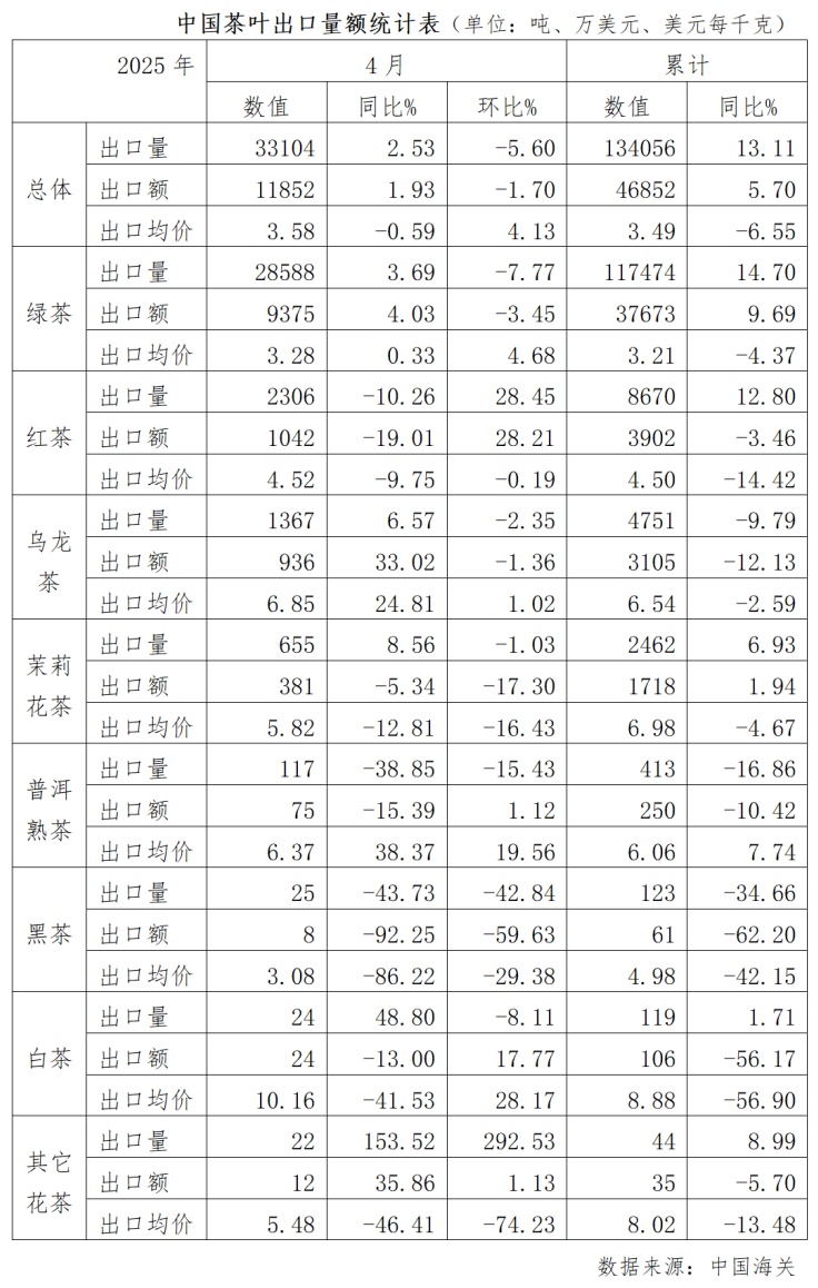 截至4月,2025年中国茶叶累计出口量为13.41万吨,同比增加13.11%,累计出口额为4.59亿美元,同比增加5.70%。1-4月出口均价为3.49美元/千克,同比下降6.55%。