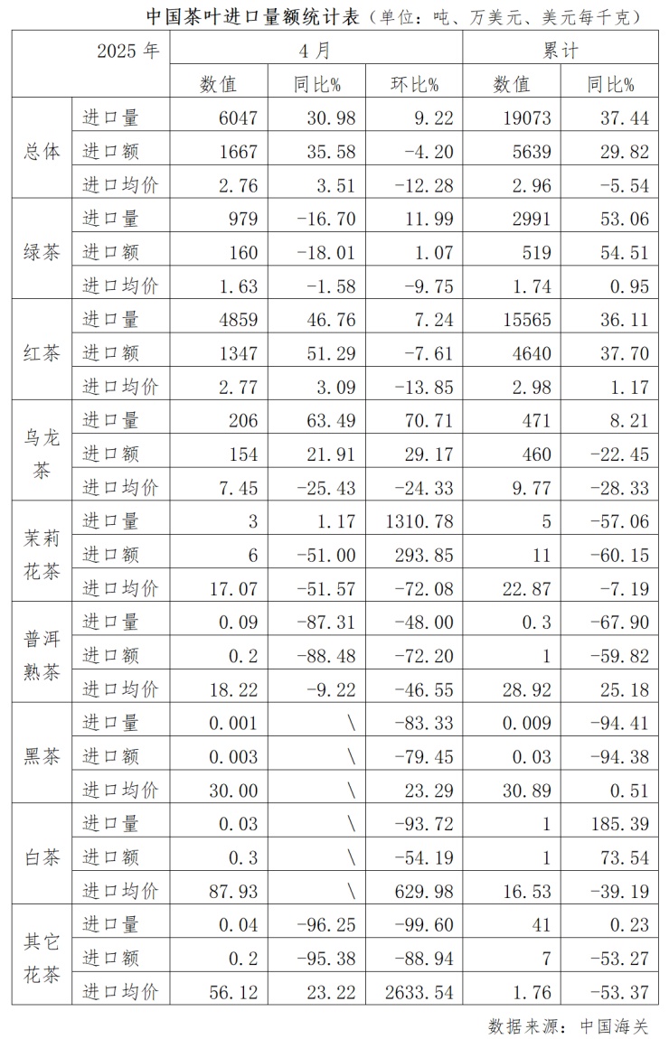 据中国海关数据:2025年4月,中国茶叶进口量为6047吨,同比增加30.98%,环比增加9.22%;进口额为1667万美元,同比增加35.58%,环比减少4.20%。4月进口均价为2.76美元/千克,同比上涨3.51%,环比下降12.28%。