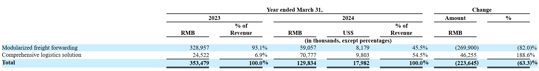 沃德通收入端大幅波动的背后,其实是公司对业务结构进行调整从而形成的表观呈现。据招股书显示,沃德通2024财年收入大降63.3%至1.3亿元主要是因为公司对低毛利的传统模块化代理业务的战略性缩减,这使得模块化代理货运服务报告期内的收入大跌82%,占收入的比例直接从93.1%下降至45.5%。
