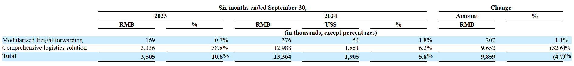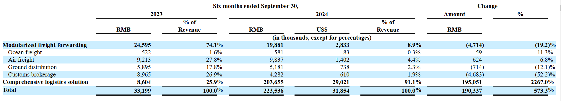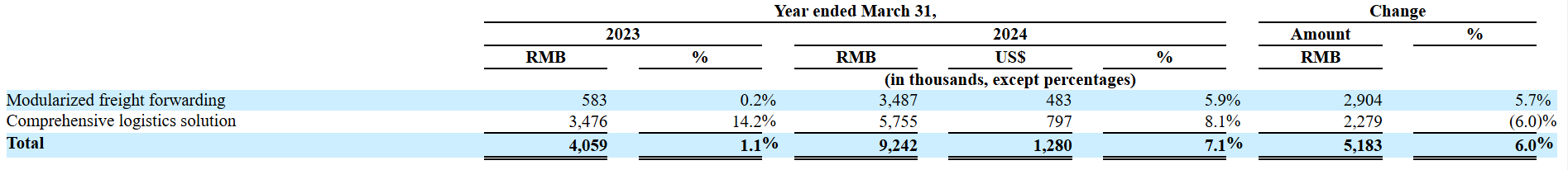 而在模块化货运代理服务收入大跌的同时,综合物流解决方案作为端到端的服务在电子商务卖家中越来越受欢迎,2024财年内沃德通交付的包裹数量从48万个增至112万,激增133.3%,这带动综合物流解决方案的收入增长188.6%至7080万元,该业务占收入的比例从6.9%直接飙升至54.5%。