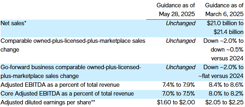 梅西百货维持了其本年度的销售预期。尽管存在进口商品关税上调、消费者非必需品支出有所减少以及竞争对手零售商促销活动增多等不利因素,但该公司仍对目标充满信心。该公司表示,其商品种类(从折扣商品到高端商品)为其提供了更多的灵活性。尽管如此,该公司下调了全年盈利预期(不包括利息、税款等项目)——将EBITDA利润率从8.4%- 8.6%下调至7.4% -7.9%。同时,该公司还下调全年摊薄后每股收益至1.6-2.0美元。