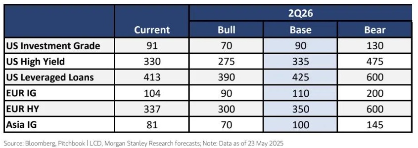 市场回暖与中美贸易关系的积极消息提升了市场乐观情绪,此前担忧“噩梦成真”的情绪有所消散,市场重新审视此前过于紧张的信用利差。大摩因此下调了全球多个地区的信用利差预测。
