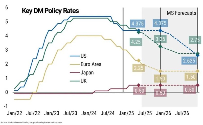 大摩认为,美国国债收益率预计将在2025年第四季度前保持震荡,届时市场将更确信美联储将降息。该行预计,10年期美债收益率将在2025年底达到4.00%。