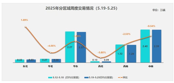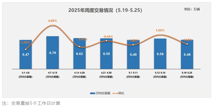 智通财经APP获悉,中国汽车流通协会发文称,2025年5月19日至25日,二手车日均交易量为6.48万辆,环比下降1.56%,同比4月同期下降1.6%,市场淡季特征明显。