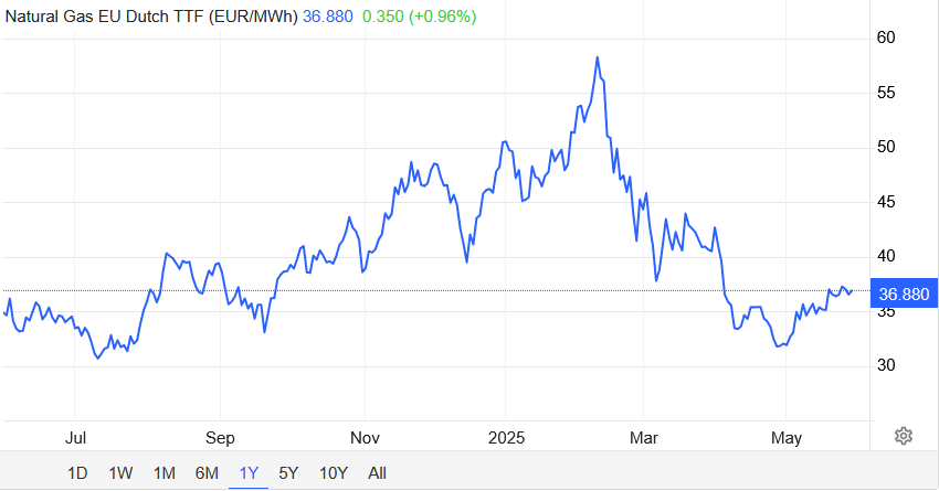智通财经APP获悉,欧洲天然气价格周四小幅走高,原因是人们猜测美国法院叫停美国总统特朗普关税措施可能会提振能源需求。截至发稿,基准荷兰TTF天然气6月期货价格涨近1%,报36.88欧元/兆瓦时。