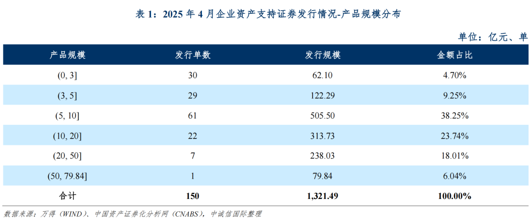 从产品规模分布来看,2025年4月发行的产品中,单笔产品最高发行规模为79.84亿元,系“山东高速集团滨莱高速资产支持专项计划”;单笔产品最低发行规模为0.46亿元,系“深圳市知识产权12号-高新投资产支持专项计划(园区中小微企业支持)”。单笔产品发行规模在(5, 10]亿元区间内的发行单数最多,共61单,金额合计占比为38.25%。具体发行规模分布如下表所示: